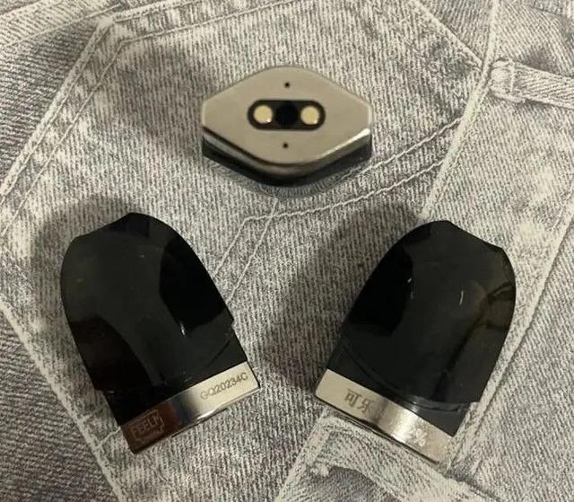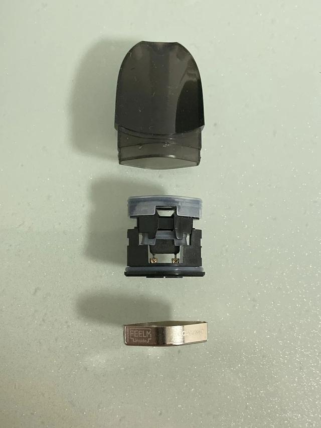 套装自带三颗烟弹,分别为可乐时光、风情芒果和绿豆冰沙口味。烟弹烟油容量为1.2ml, 发热材料为Feelm高级定制陶瓷雾化芯,阻值1欧姆。