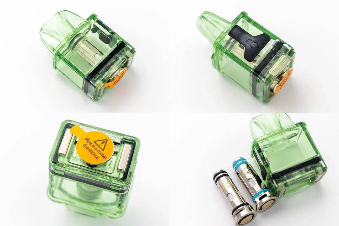 JELLY BOX nano的烟弹部分采用了开放式设计,可以重复注油。雾化元件采用了成品棉质网芯,目前有1Ω和0.5Ω两种规格。在第一次使用时要揭掉烟弹底部的保护贴,更换雾化芯也是在此处直接拔出替换即可。雾化芯在与仓体连接处设有共三道密封圈,用户不必担心漏油。