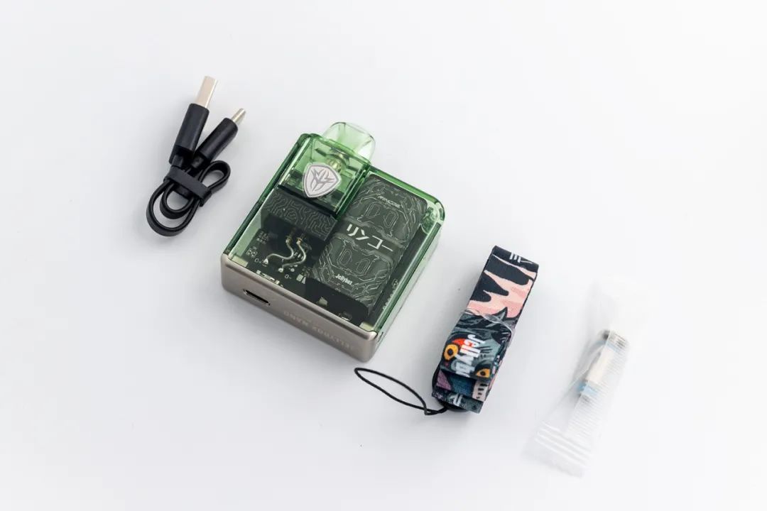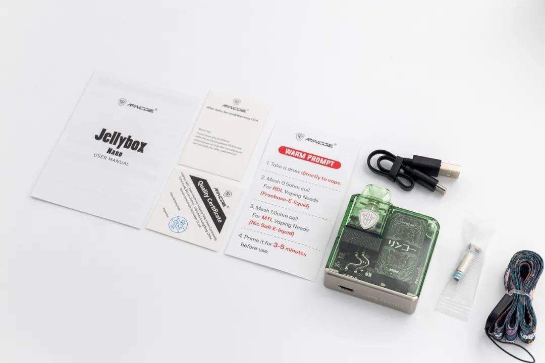 内容物包括用户手册、保修卡、合格证、用前须知,JELLY BOX nano套装、成品雾化芯1枚、充电线1根、挂绳1根。