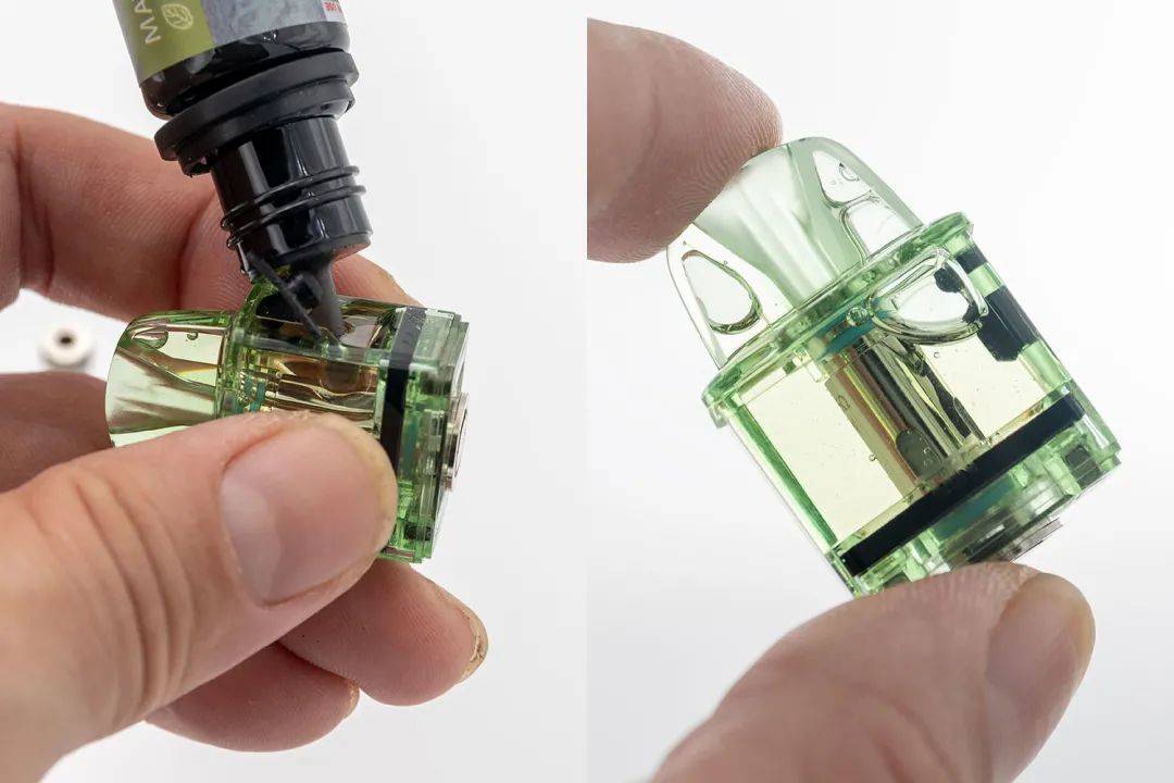 烟弹侧面带有一个尺寸较大的硅胶塞,掀开后可以添加烟油,如果是新的雾化芯首次使用,要在注油后静置几分钟,让烟油重复浸透雾化芯内导油棉后方可使用,避免烧糊雾化芯。