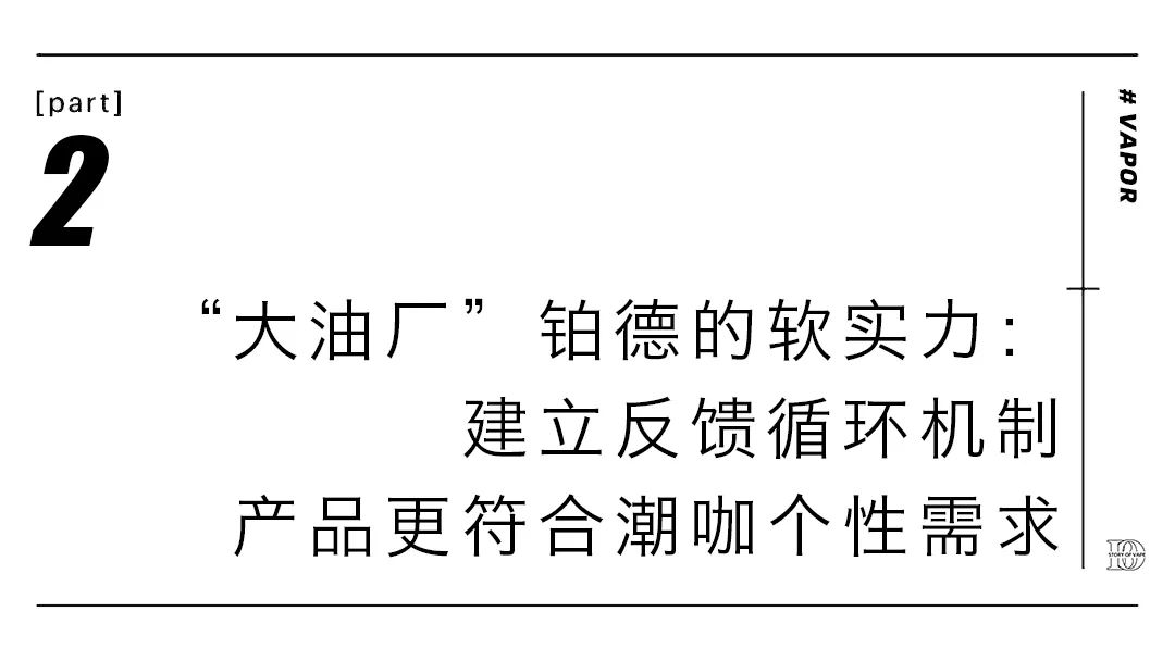 铂德更侧重“重资产”的方式,坚持“死磕技术、死磕产品、死磕雾化液”的品牌理念,坚持全产业链布局,自主研发系列产品,掌握雾化液、雾化芯等核心技术,在打造产品上可谓是游刃有余。获得消费者高度赞誉的铂德费雪油就是一大例证。
