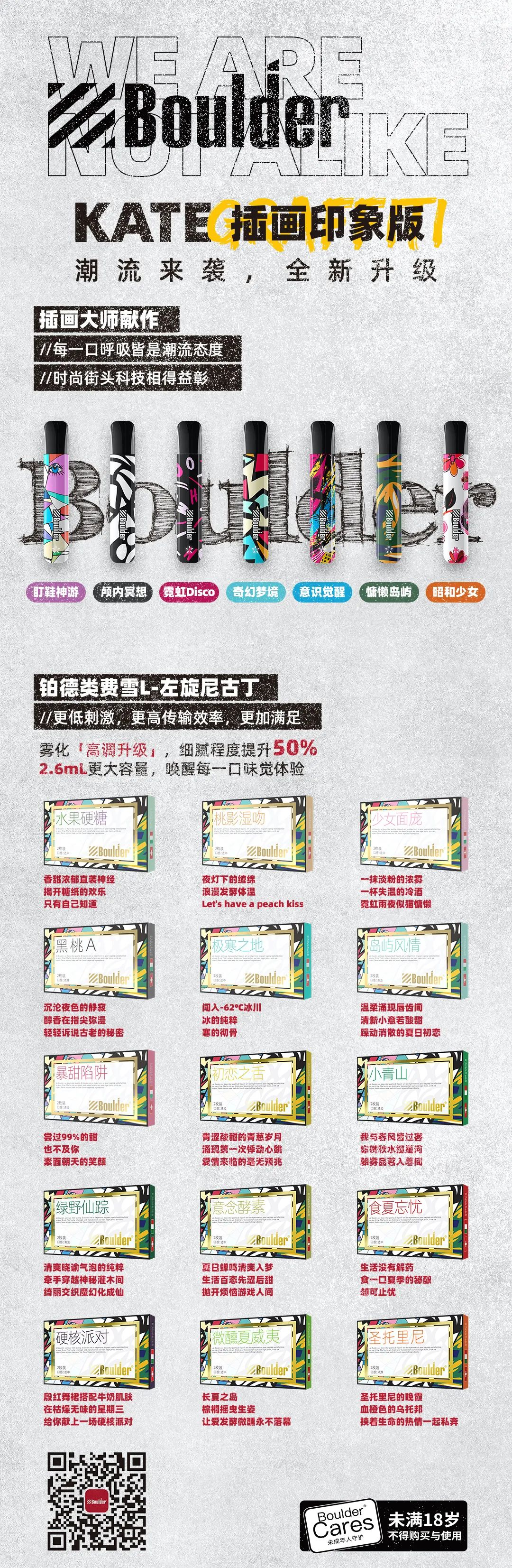 插画印象版KATE Graffiti视觉上融合了涂鸦、复古、撞色等元素,拿在手里即是潮流。适配的雾化弹,也不再是“直接”的口味命名,给了使用者充分的想象空间,形成铂德独有的蒸汽美学。