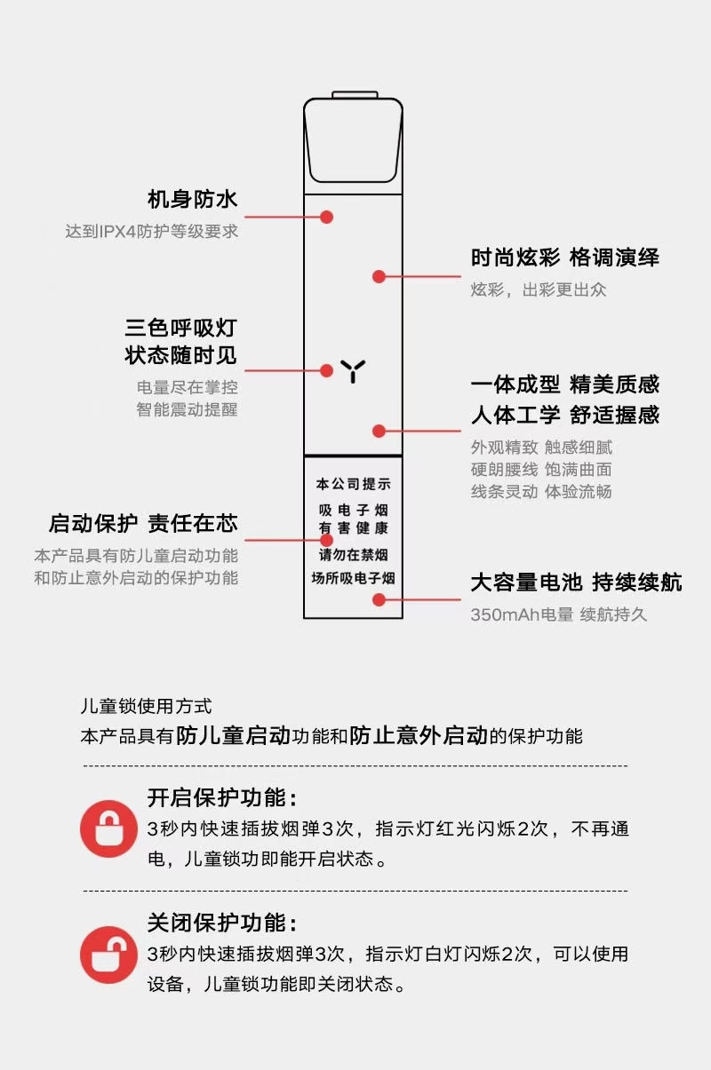关闭保护功能:3秒内快速插拔烟弹3次,指示灯白灯闪烁2次,可以使用设备,儿童锁功能即关闭状态。